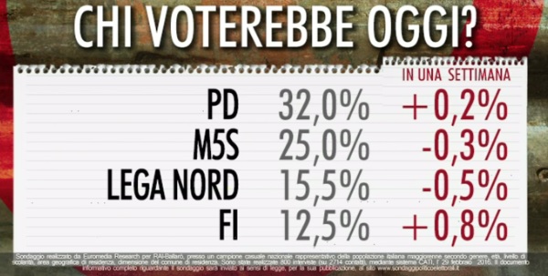Tra i partiti maggiori il Pd rimane stabile guadagnando solo due decimi e andando al 32%, mentre però il suo più diretto inseguitore, il Movimento 5 Stelle non riesce a imboccare a ripresa e anzi perde uno 0,3% calando al 25%, 7% indietro.