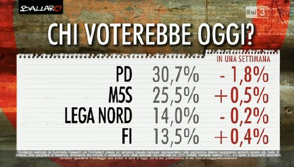 La Lega Nord è addirittura in calo di due decimi al 14%, mentre continua a crescere Forza Italia, al 13,5%, +0,5%.E Fratelli d’Italia è stazionaria al 4,7%