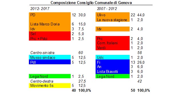 Una delle conseguenze più importanti del successo del M5S è l’ingresso di ben cinque consiglieri all’interno del Consiglio Comunale. Con questo risultato il movimento di Beppe Grillo può disporre di un numero di consiglieri pari a quello del Pdl e della lista civica che ha sostenuto Enrico Musso. Questa forza politica avrà quindi un peso notevole all’interno dell’aula consigliare, anche se la maggioranza a disposizione di Marco Doria è tale da non rendere necessario il suo sostegno esterno. Analizzando la composizione del Consiglio Comunale si nota inoltre che gli equilibri tra centro-destra e centro-sinistra si sono modificati non tanto per una crescita di quest’ultimo schieramento, quanto per il forte declino del primo.