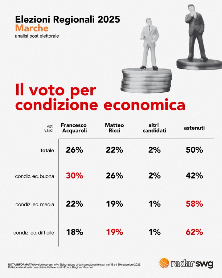 Neanche analizzando l’elettorato in base alla condizione economica Swg ha rilevato particolari aggregazione di favore per Ricci mentre Acquaroli pare sicuramente aver convinto i più abbienti.