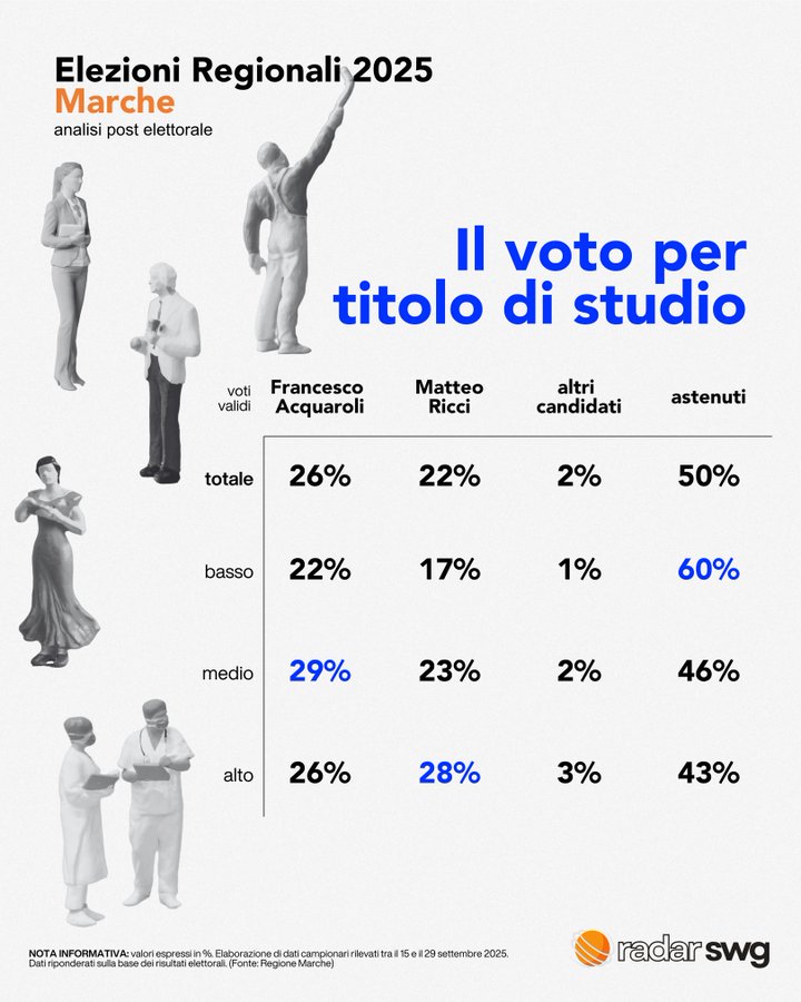 Swg stringe lo sguardo anche sul titolo di studio degli elettori: si nota una leggera preferenza per Ricci dei votanti con titolo di studio più “alto”. Tuttavia, è schiacciante l’affermazione di Acquaroli tra chi ha un percorso formativo meno corposo.