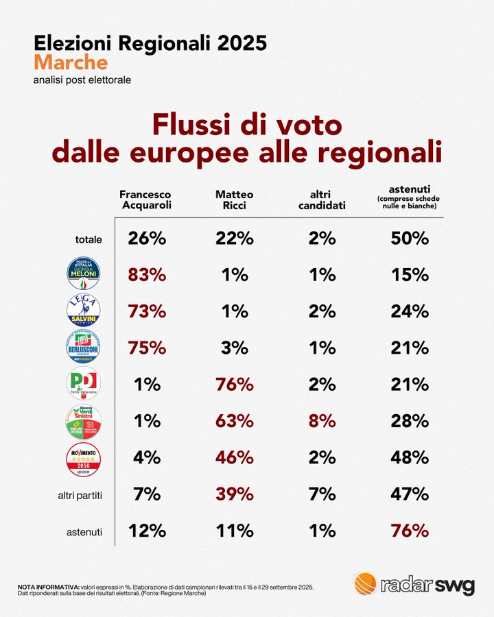 Sondaggi elettorali Swg: rispetto alle Europee, non sembrano esserci stati grossi spostamenti di elettorato tra un partito e l’altro alle ultime Regionali marchigiane. Semmai evidente è lo spostamento, soprattutto per quanto riguarda il Movimento 5 Stelle, degli elettori verso l’astensione (che in quest’occasione ha toccato quota 50% degli aventi diritto).