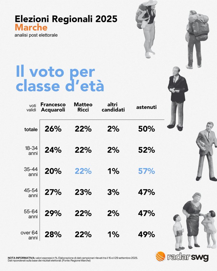 L’istituto pubblica un focus sul recente voto nelle Marche. Le Regionali di fine settembre, le uniche realmente “incerte” tra tornate per il Governatore che si terranno in autunno, hanno visto affermarsi per un secondo mandato Francesco Acquaroli, esponente di Fratelli d’Italia e candidato del centrodestra in versione maggioranza nazionale. Guardando ai dati Swg su come si è mosso l’elettorato in base alla fascia d’età sembra sia stata decisiva l’affermazione di Acquaroli a mano a mano che gli anni aumentavano.