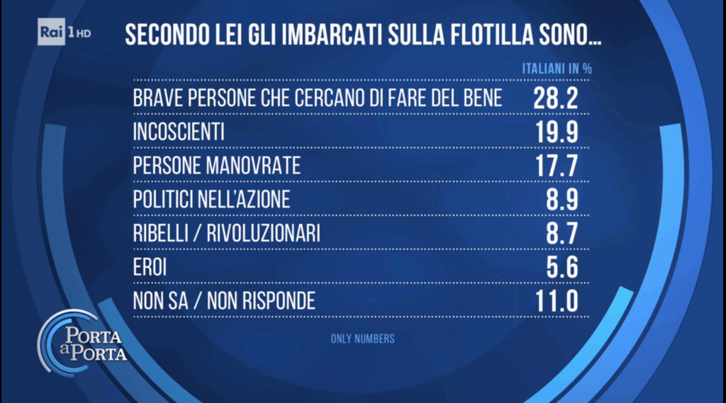 Secondo questi sondaggi elettorali di Euromedia, realizzati appena prima dell’intercettazione israeliana, gli italiani erano divise sul giudizio di coloro che erano imbarcati sulla Sumud Flotilla. Per il 28,2%, si trattava di brave persone che cercavano di fare del bene e a questi si aggiungeva un 8,7% che li definiva rivoluzionari e un 5,6% per cui erano eroi, mentre per l’8,9% sono politici in azione.