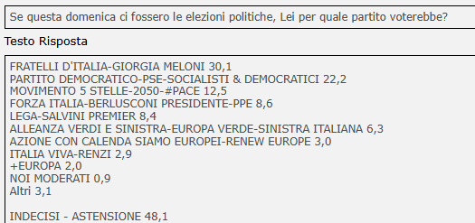 Al centro Azione raggiunge la soglia, con il 3%, ma non va oltre, e i partiti minori, tutti insieme, sono al 3,1%. Molto alti gli indecisi e i potenziali astenuti, ben il 48,1% del totale.
