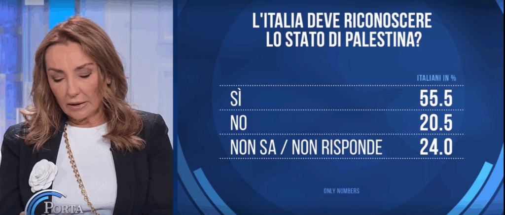 C’è un diffuso sentimento a favore del mondo palestinese, è questo che sembra emergere, non a caso solo il 20,5% è contro il riconoscimento della Palestina, mentre il 55,5% è favorevole e degno di nota è il fatto che ben il 24% non si esprime.