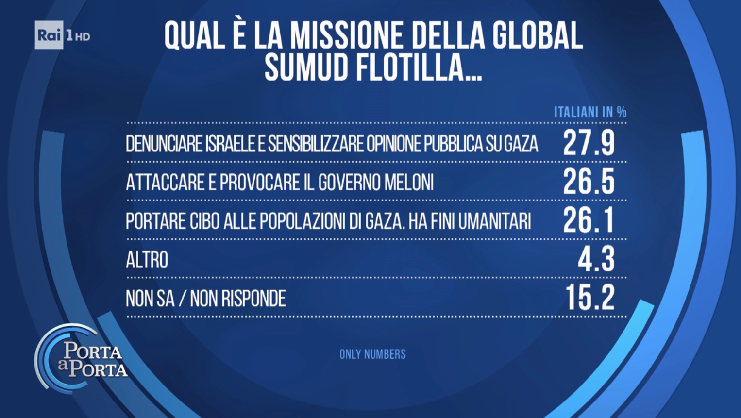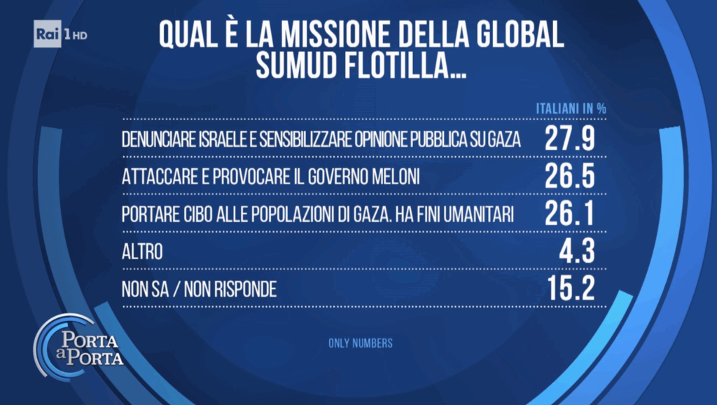 Per la maggioranza, poi, la missione della Flotilla era positiva, per il 27,9% era denunciare Israele e sensibilizzare l’opinione pubblica su Gaza, mentre per il 26,1% era portare cibo alle popolazioni, solo per il 26,5% lo scopo era attaccare il Governo Meloni.