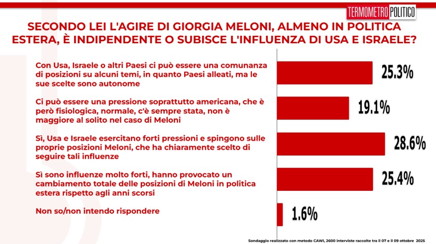 Sondaggi politici elettorali TP 10 ottobre 2025 - Giorgia Meloni e l'indipendenza nella politica estera