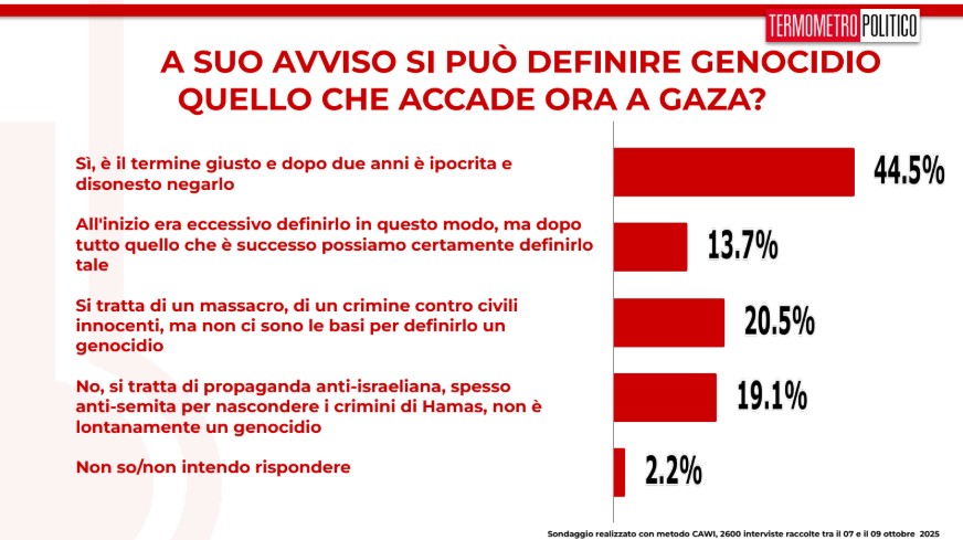 Bentornati con il sondaggio settimanale di Termometro Politico. Focus sugli ultimi sviluppi relativi al conflitto israelo-palestinese e alle moltitudinarie manifestazioni in tutta Italia a favore della Palestina e della Sumud Flotilla. Spazio anche all’indipendenza del Governo sulla politica estera e alla percezione dei media e al taglio con cui propongono il conflitto. E poi, a distanza di tempo, torniamo a chiedere: a Gaza, è genocidio?