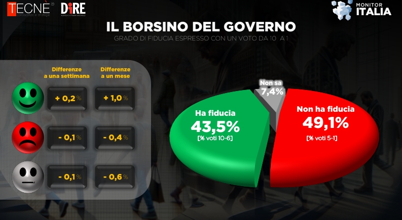 I sondaggi elettorali Tecné approfondiscono regolarmente anche la fiducia degli italiani nell’esecutivo. Stando all’ultima rilevazione in crescita il gradimento, di ben un punto rispetto al mese scorso, anche se sono ancora circa il 49% coloro che dichiarano di non avere fiducia nel governo.