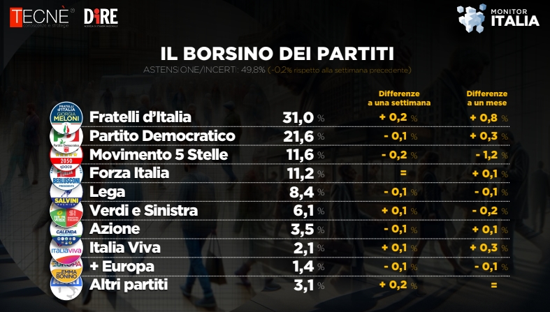 Sondaggi elettorali Tecné: FdI guadagna lo 0,8% in un mese e arriva al 31%