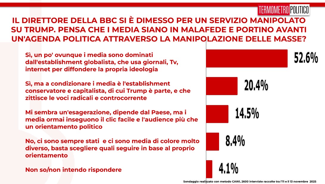 E prima di passare a intenzioni di voto e fiducia in Giorgia Meloni, parliamo dello scandalo del direttore della BBC che si è dimesso per un servizio manipolato su Trump. Abbiamo chiesto se i media sono in malafede e portano avanti un’agenda politica attraverso la manipolazione delle masse.