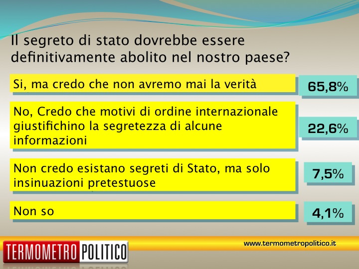 La prima domanda fa registrare una distribuzione percentuale molto chiara a favore dell’abolizione del segreto di Stato; esiste poi un 20% circa che invece accetta la necessità di mantenere segrete alcune cose per motivi di interesse internazionale.