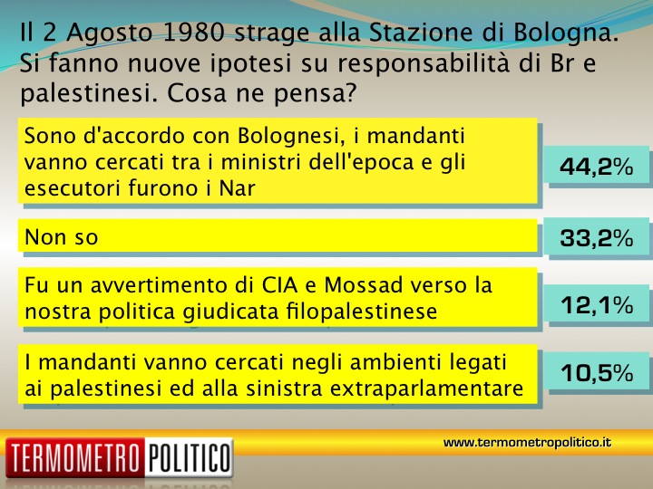 [ad]Per la maggioranza del nostro campione la responsabilità di quella strage va ricercata tra la classe dirigente dell’epoca, per quello che attiene i mandanti. In merito agli esecutori, la stessa percentuale individua nei Nar i responsabili materiali della strage.