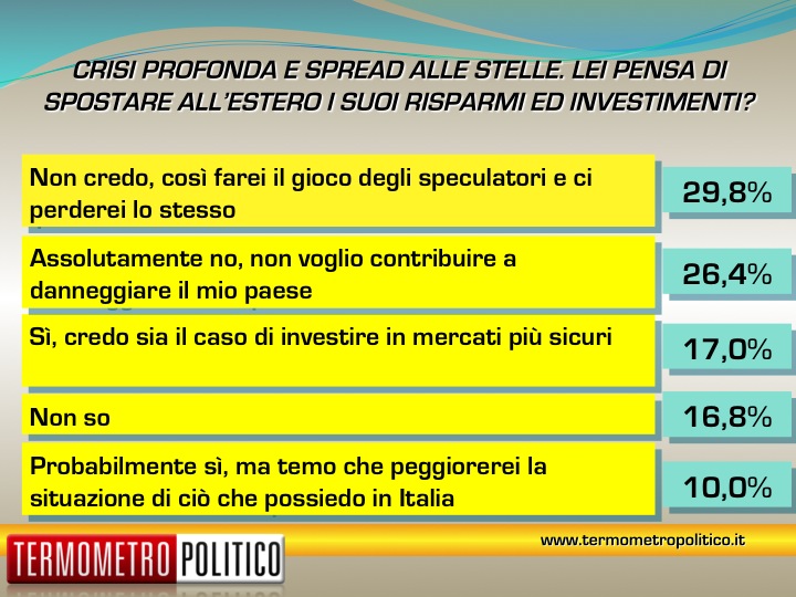 Il sondaggio realizzato dal Termometro Politico si interessa della terribile combinazione risalita dello spread-elezioni anticipate. Un combinato disposto che, ad inizio estate, aveva fatto rivivere nella mente di molti l’estate del 2011 dove lo il default sembrava ad un passo.