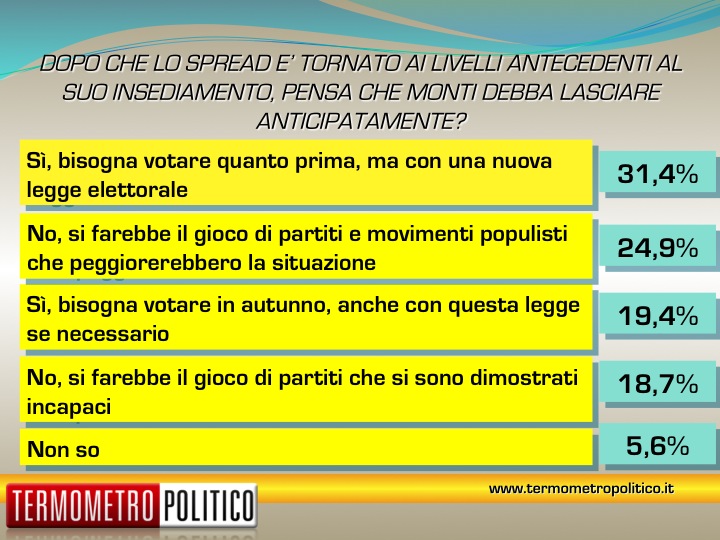 Alla luce di questa situazione abbiamo quindi domandato se le elezioni anticipate e l’abbandono di Monti non rappresentino una possibilità reale e auspicabile. Le risposte presentano uno scenario abbastanza polarizzato. Da una parte c’è un 50% di elettori che ritiene utile andare al voto anche se per il 31% di questi è indispensabile fare una nuova legge elettorale.