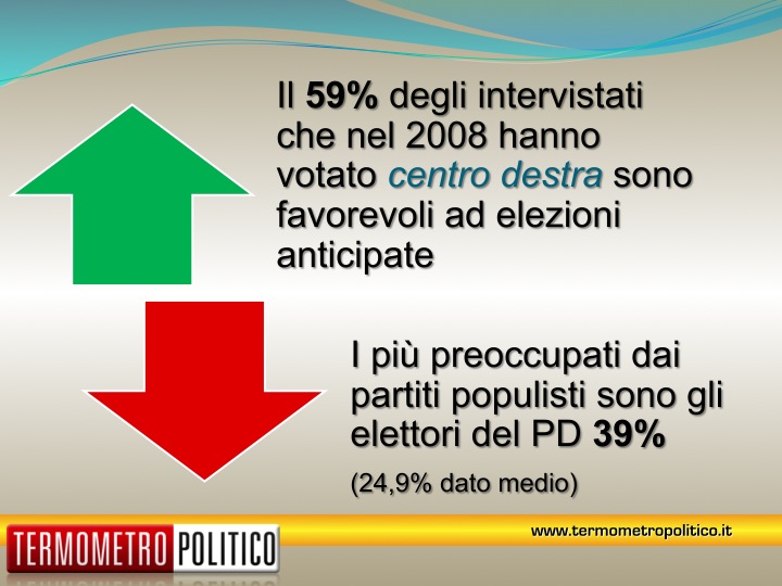 [ad]Il sondaggio rivela quindi una certa preoccupazione ma, incrociando i dati sui risparmi e sulla necessità di elezioni anticipate appare evidente la percezione di un pericolo ormai alle spalle e, allo stesso tempo, la necessità di un cambio dopo questo periodo di “montismo”forzato”.