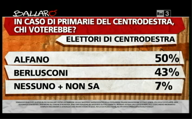 Motivo per cui Angelino Alfano, segretario del Pdl immediatamente tornato nei ranghi di fedele scudiero di Silvio Berlusconi, batterebbe in caso di consultazione fra gli elettori del suo schieramento l’ex premier. Per Alfano si esprimono i pareri del 50% degli intervistati, mentre solo il 43% privilegerebbe Berlusconi. Un ulteriore 7% è indeciso.
