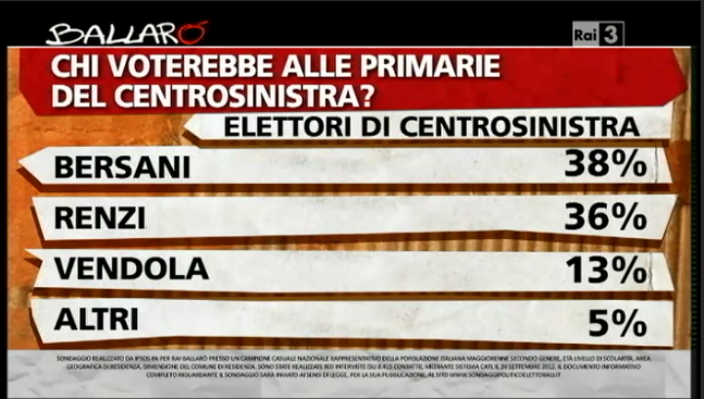 Matteo Renzi è ad un passo da Pierluigi Bersani. Secondo l’ultimo sondaggio di Ipsos divulgato dal presidente Nando Pagnoncelli nel corso della puntata di questa sera di Ballarò il sindaco di Firenze avrebbe ridotto lo svantaggio a soli due punti percentuali.