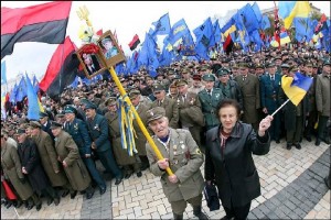 A causa di ciò, mi ero sempre battuto insistentemente contro chi, non conoscendo il nuovo volto dell’Est Europa o pur conoscendolo, si ostinava ad impiegare categorie non applicabili e legittimava le proprie posizioni con l’abusata opinione “il nazionalismo va sempre criticato ed evitato”. Domenica 14 ottobre però, invitato dal tepore di un autunno che sembrava proprio non voler arrivare, ho deciso di concedermi una rilassante passeggiata nel centro cittadino di Lviv. Inconsapevole della concomitante ricorrenza delle celebrazioni per il settantesimo anniversario dell’Esercito Insurrezionale Ucraino (UPA), con grande sorpresa, invece di imbattermi nelle volte e nei merletti adornanti i mitteleuropei edifici cittadini, ho incrociato sul mio percorso sbraitanti cortei capitanati da militari in divisa. E così il volto del nazionalismo, ossia la forza progressista a capo dei maggiori cambiamenti avvenuti dopo il crollo dell’Unione Sovietica, si è rivelato assumere connotazione completamente diversa. Ho avuto infatti la possibilità di guardarlo in faccia e ciò mi ha profondamente disgustato. Oltre ai rulli di tamburo e a slogan scanditi da un megafono e liturgicamente ripetuti dai pretesi celebranti, l’immagine creantemi maggior sgomento è stata l’interminabile fila di giovani in mimetica che, al fine di compiacere i propri superiori, faceva a gara a chi levava più alte le bandiere e a chi berciava più forte gli sbalorditivi incitamenti. Il bagno di folla garantito loro da una fitta schiera di vecchietti, memori delle decantate gesta dell’UPA, li ha accolti in una delle principali piazze cittadine.