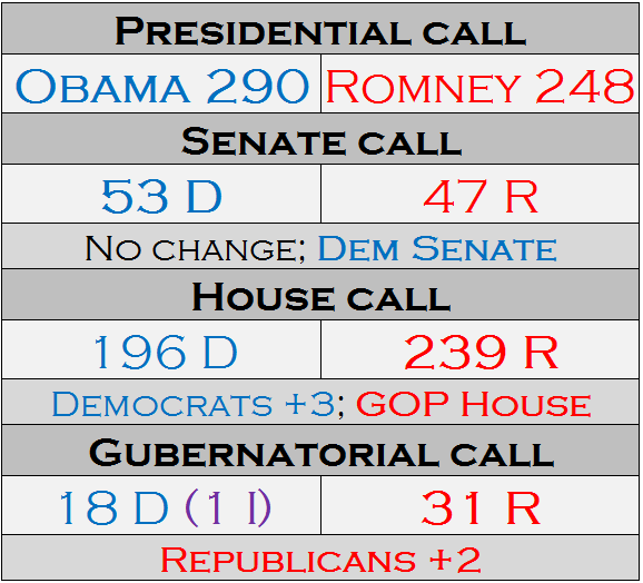 Larry Sabato, però, si espone anche con una previsione senza toss-up e scommette – nel verso senso della parola – su una vittoria del presidente per 290 voti elettorali a 248, con equilibri inalterati al Congresso dove i democratici resterebbero solida maggioranza al Senato e i repubblicani si confermerebbero alla Camera dei Rappresentanti. Tutto ciò mentre i sondaggi a livello nazionale danno perfetta parità fra i due candidati nel voto popolare. Rasmussen dà in vantaggio Romney del’1%, laddove WsJ vede avanti di un punto percentuale Obama. Mentre Politico e Cnn con due differenti rilevamenti parlano proprio di parità.