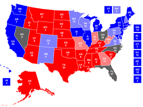 Questa e’ la mappa secondo me che mostra la proiezione per il 4 novembre. Proiezione suscettibile di cambiamenti in caso di eventi nuovi significativi (chesso’ la cattura di Bin Laden per esempio).