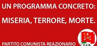 Un caso più complesso e sofisticato è invece quello del Partito Comunista Reazionario. Si tratta di un immaginario Partito (che parla sempre di sè in terza persona indicandosi come “il Partito”) che si pone come erede tanto del comunismo reale (nelle sue varie versioni sovietica, coreana, cubana, cinese) quanto della tradizione cattolica più reazionaria, proponendo una sintesi basata su un atteggiamento programmaticamente dogmatico e intollerante, che esige dai militanti una fede e un’adesione acritica e incondizionata.