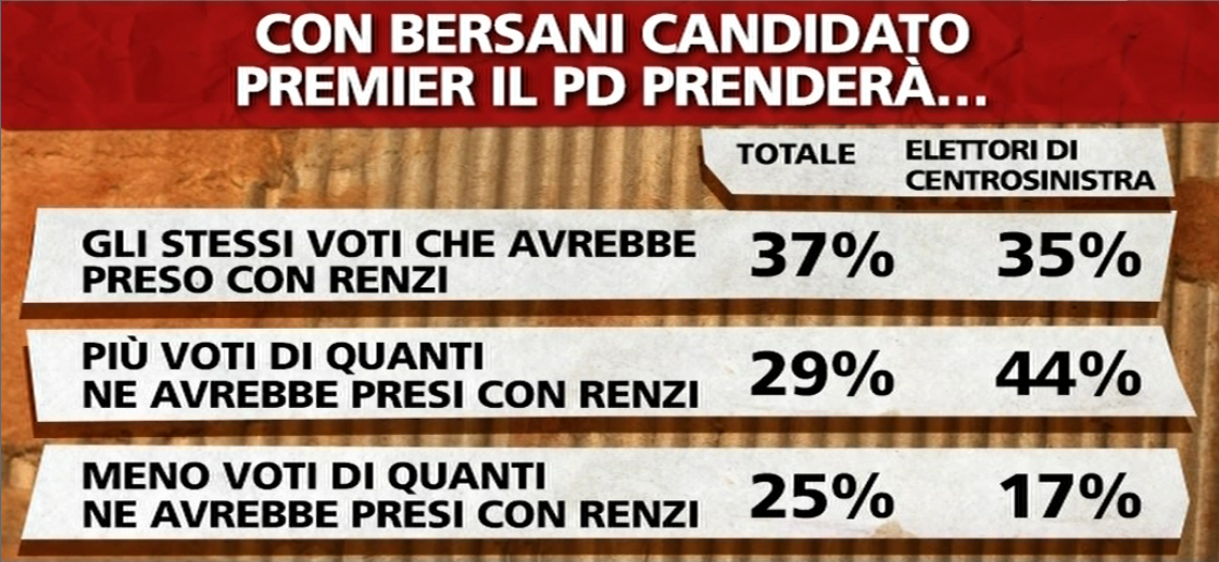 È meglio anche in questo caso analizzare con chiarezza. Pur incarnando umori in contraddizione questi due dati sarebbero davvero allarmanti soltanto in presenza di una sfida molto più competitiva con differenze di consenso ridotte. Non è questo il caso. E Bersani può affrontare la campagna per le politiche con una maggiore serenità considerando un altro dato del sondaggio Ipsos. Il Pd – come sappiamo – oscilla fra il 36% attribuito dall’istituto di Nando Pagnoncelli al 38% assegnato da Demos&Pi. Uno degli argomenti più ripetuti nella campagna elettorale di Matteo Renzi è che con lui candidato il Pd e il centrosinistra avrebbero avuto un risultato migliore alle elezioni in maniera tale da poter avere salde maggioranze sia alla Camera che al Senato per governare nel prossimo quinquennio. Bene, questa convinzione oltre che dalla percentuale di suffragi attribuita all’alleanza Pd-Sel è smentita pure dalle previsioni degli stessi elettori. Quanti voti prenderà il Partito Democratico con Bersani candidato premier? Il 37% è convinto che Bersani manterrà lo stesso livello di consensi agguantabili con Renzi leader, mentre un 29% immagina un successo ancor più rotondo alle elezioni politiche grazie alla vittoria interna del segretario democrat.