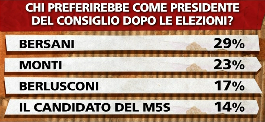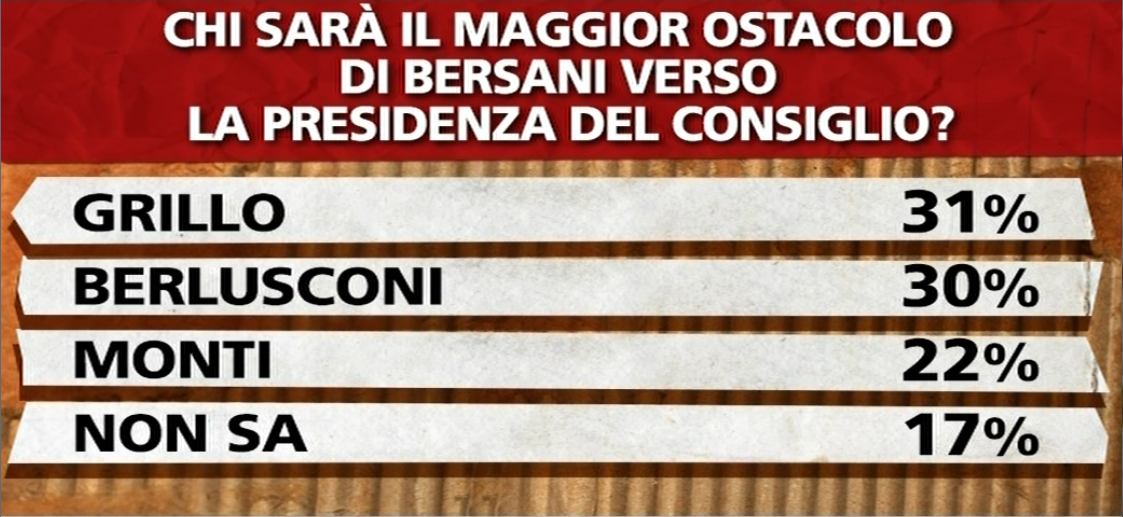 Bersani supera Monti. Berlusconi e Grillo gli avversari più temibili