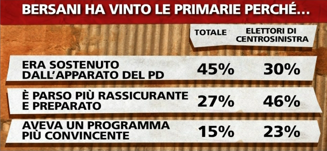 Secondo dato critico per Bersani. Se all’interno del centrosinistra il suo indiscutibile successo al ballottaggio delle primarie è frutto di una leadership più rassicurante (lo pensa quasi un elettore progressista su due) sull’intero campione le proporzioni si ribaltano e circa il 45% attribuisce l’affermazione sul competitor Matteo Renzi alla capacità di mobilitazione dell’apparato del Partito Democratico, schierato nella sua quasi interezza dalla sua parte.