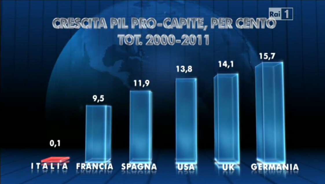 I mercati non hanno apprezzato il ritorno di Berlusconi, l’uomo che ha governato l’Italia per nove degli ultimi dodici anni e che ha fatto registrare sotto la sua guida una performance economica estremamente bassa: la ricchezza per persona, ad esempio, è cresciuta di appena lo 0,1% dal 2000 al 2011, una prestazione deludente soprattutto se rapportata a quella di altri Paesi dell’area dell’Euro, come la Francia (cresciuta del 9%), la Germania (+15%) e addirittura la Spagna (+12%).