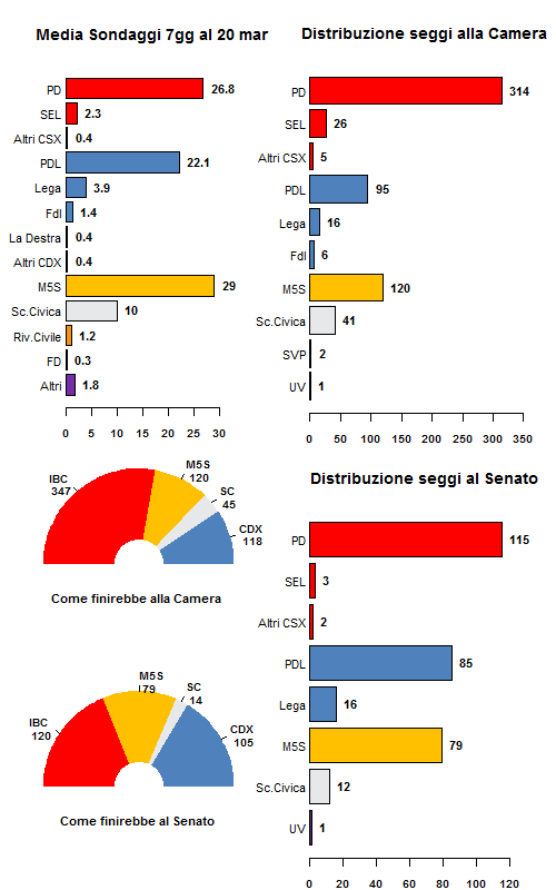Se infatti alla Camera il Centrosinistra è ancora in testa per una inezia al Senato la situazione appare ancora più incerta dell’attuale con il Movimento 5 Stelle che rimpinguerebbe notevolmente il suo bottino in termini di seggi, balzando a 79 eletti, a scapito sopratutto di Scelta Civica e PDL.