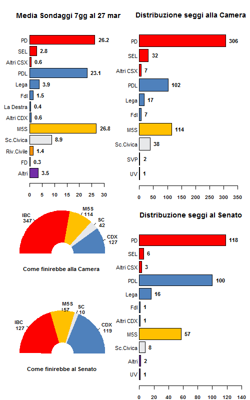 [ad]A un mese dalle elezioni il quadro politico continua ad apparire assolutamente cristallizzato. Se in fatti il MoVimento di Grillo si sgonfia rispetto alla settimana scorsa e ripiega sui valori ottenuti il 25 febbraio, il PDL cresce nei sondaggi ma a scapito dei suoi alleati minori e simili dinamiche si vedono nella coalizione di centrosinistra. Cosi’, anche per questa settimana la coalizione di Bersani risulta prima con il 29.6% seguita dal centrodestra al 29.4% replicando praticamente il risultato delle scorse elezioni. Chi invece continua a perdere consenso e’ Scelta civica che al Senato dimezzerebbe la sua pattuglia parlamentare. Una situazione di stallo dovuta anche alla convulta situazione politica attuale che vede i partiti alle prese con un muro contro muro. Se Grillo infatti dice no a qualsiasi fiducia ad un governo a guida Bersani, il Pdl chiude a possibili intese con il Pd qualora non venissero accettate le istante di un accordo sul prossimo presidente della Repubblica. Nelle prossime ore si capirà di più per quanto riguarda la formazione del nuovo governo. Gli eventi che avverranno nei prossimi giorni potrebbero cambiare moltissimo nella percezione, nel consenso e quindi nelle intenzioni di voto degli italiani. A seconda della piega che prenderanno le cose potrebbero esserci grosse novità da parte dei sondaggi elettorali.