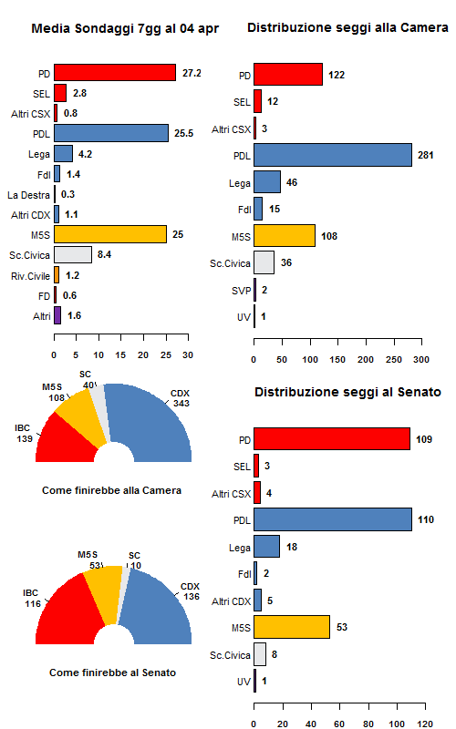 Questa ulteriore settimana di polemiche sul governo ha indebolito notevolmente il MoVimento 5 Stelle che lascia sul terreno quasi 2 punti percentuali, avanzano invece sia PD e PDL con il partito di Berlusconi che ha la crescita più sostenuta e trascina la sua coalizione al primo posto dopo parecchi mesi. Continua invece il lento declino si Scelta Civica che soffre l’attuale irrilevanza nel panorama politico nazionale.