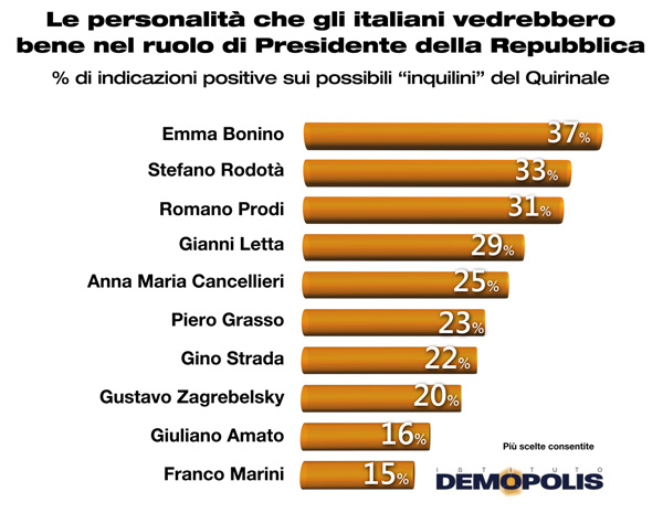 [ad]Rispecchiando le notizie rimbalzate sui mezzi d’informazione negli ultimi giorni, i nomi indicati come possibili Presidenti sono quelli di cui si è maggiormente discusso. Al primo posto si piazza Emma Bonino, preferita dal 37% degli intervistati; a lei seguono – secondo il sondaggio dell’Istituto Demopolis – Stefano Rodotà con il 33% delle preferenze e l’ex presidente del Consiglio Romano Prodi con il 31%. A poca distanza anche l’ex sottosegretario alla Presidenza del Consiglio Gianni Letta (29%) , e l’attuale ministro degli Interni Cancellieri (25%). Tra i possibili futuri Presidenti della Repubblica, gli intervistati annoverano anche il neo Presidente del Senato Piero Grasso, il fondatore di Emergency Gino Strada e l’ex presidente della Corte Costituzionale Zagrebelsky. Due nomi dati come “forti” in questi giorni, ma che si trovano invece staccati dagli altri nelle preferenze sono Giuliano Amato e l’ex segretario generale della Cisl Franco Marini.