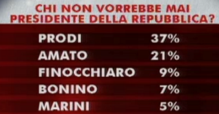 Al secondo posto di questa classifica negativa troviamo Giuliano Amato, sulla cui candidatura si è molto discusso nelle ultime settimane, che risulta inviso dal 21% degli intervistati, mentre incontrano minore ostilità la senatrice del PD Anna Finocchiaro (9%), la radicale Emma Bonino (7%) e Franco Marini (5%), il candidato che non è riuscito ad ottenere i voti necessari nella votazione di ieri.